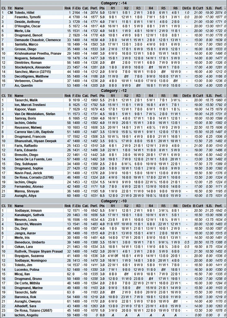 Tournoi FIDE pour jeunes par catégories (- 8, - 10, - 12 et - 14 ans).